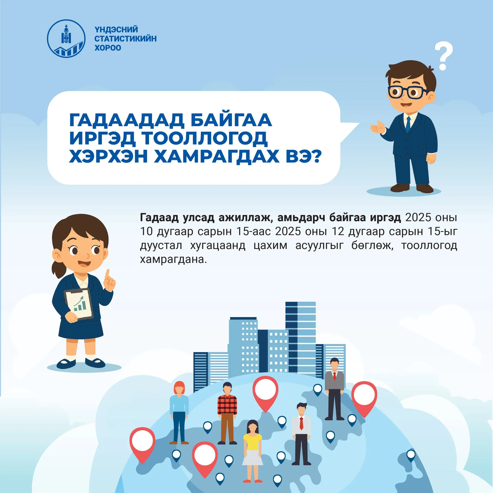 Гадаад улсад оршин суугаа Монгол Улсын иргэн та http://citizen.2025.mn холбоосоор нэвтэрч, Хүн ам, орон сууцны 2025 оны завсрын тооллогод хамрагдаарай.Тодруулбал http://citizen.2025.mn холбоосоор бүртгүүлсний дараа таны цахим шууданд нэвтрэх мэдээлэл илгээх бөгөөд тус зааврын дагуу тооллогын асуулгад хариулах боломжтой. Монгол Улсын иргэн та Хүн ам, орон сууцны 2025 оны завсрын тооллогодоо идэвхтэй хамрагдаарай.
